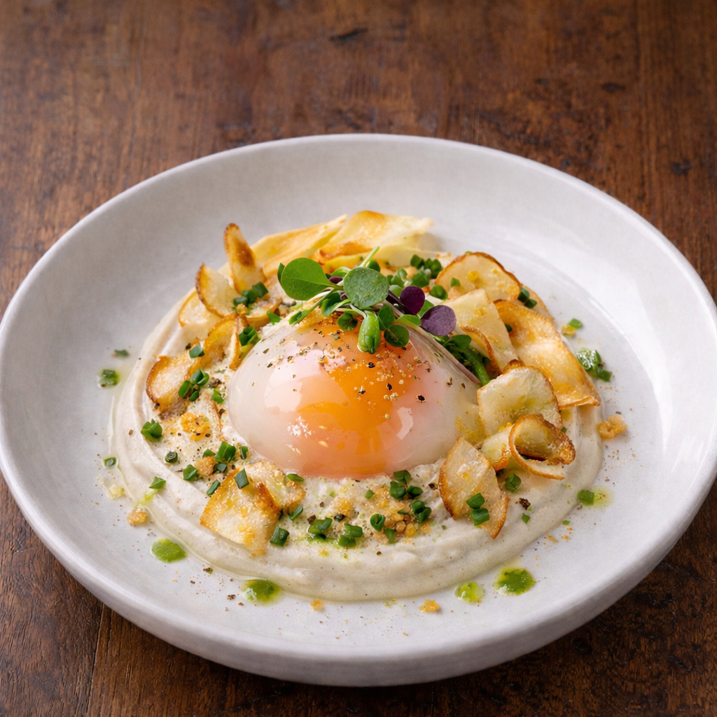 Purée de topinambours et chips de panais.