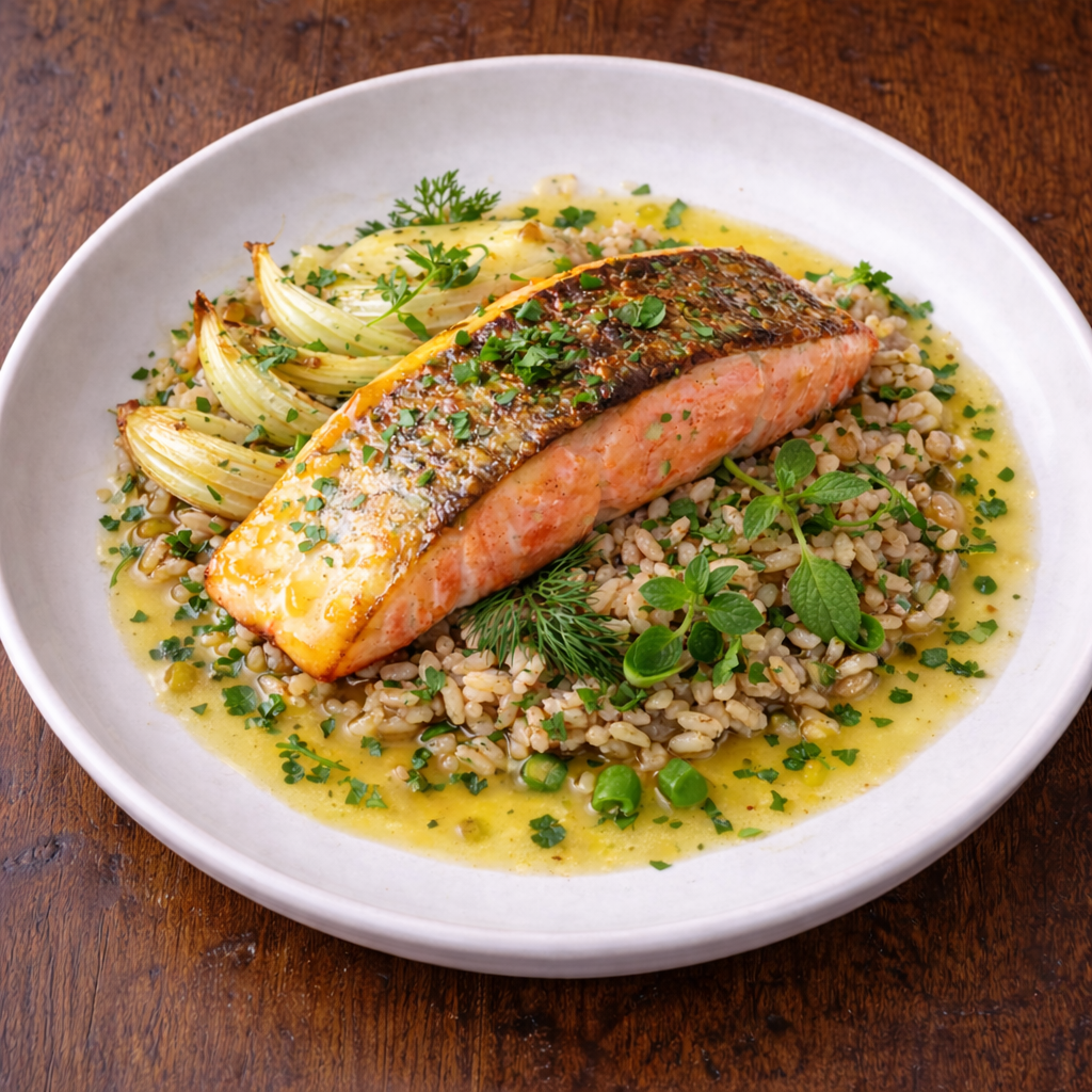 Fenouil rôti, riz complet bio et herbes du potager